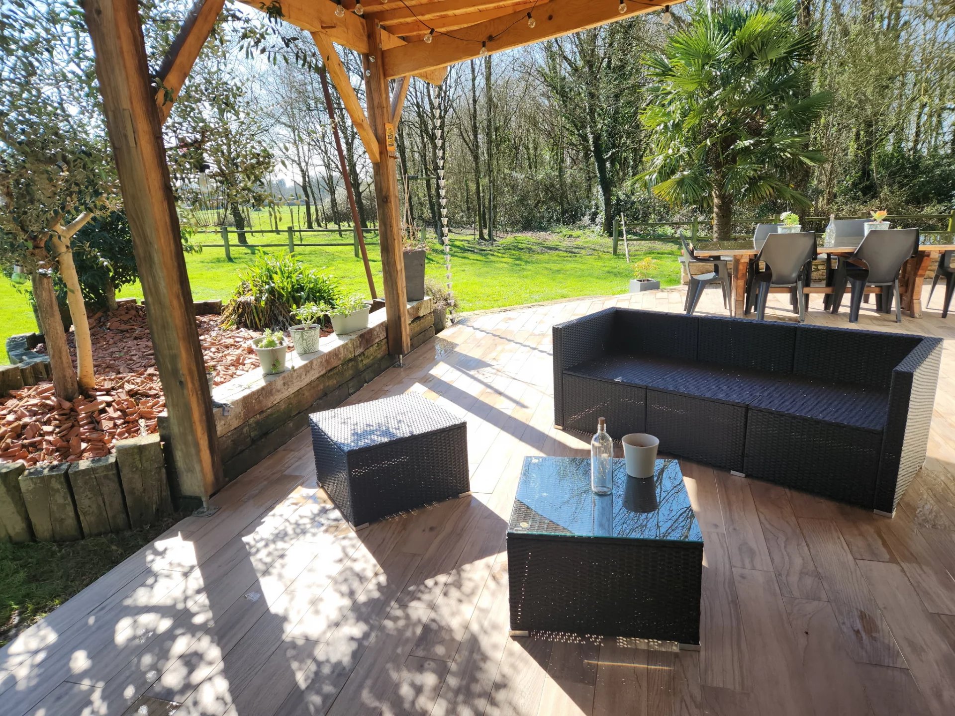 Un garage, une grande terrasse avec sa pergola et un abris de jardin.